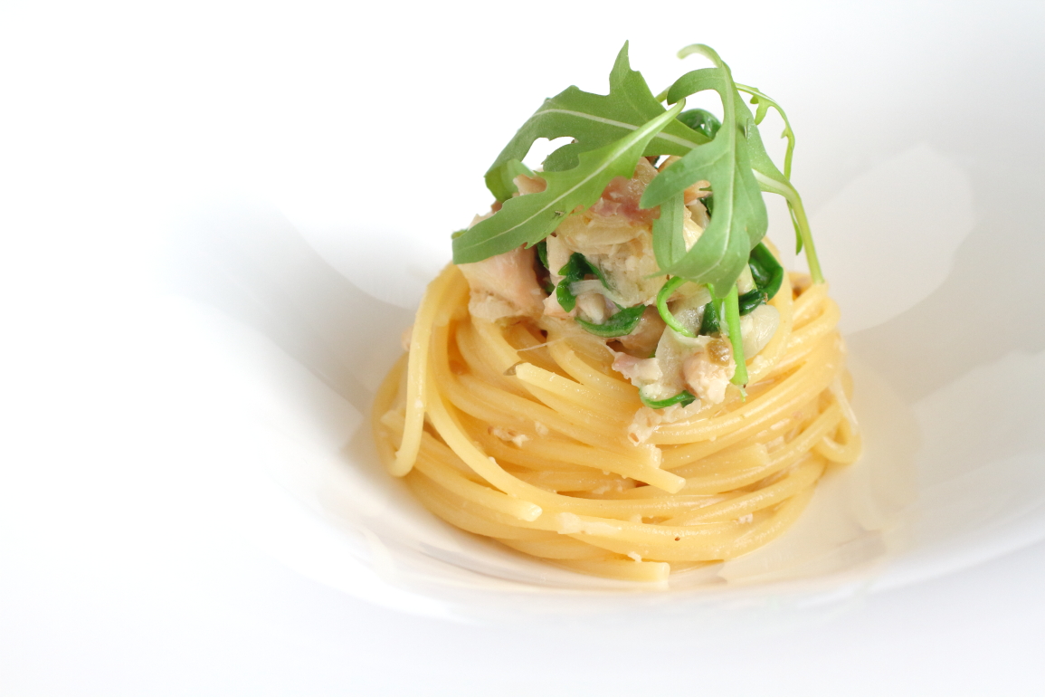ややピリ辛のイタリア野菜、ルーコラセルバティカが、チーズを絡めたスパゲッティーニのアクセントになっています。