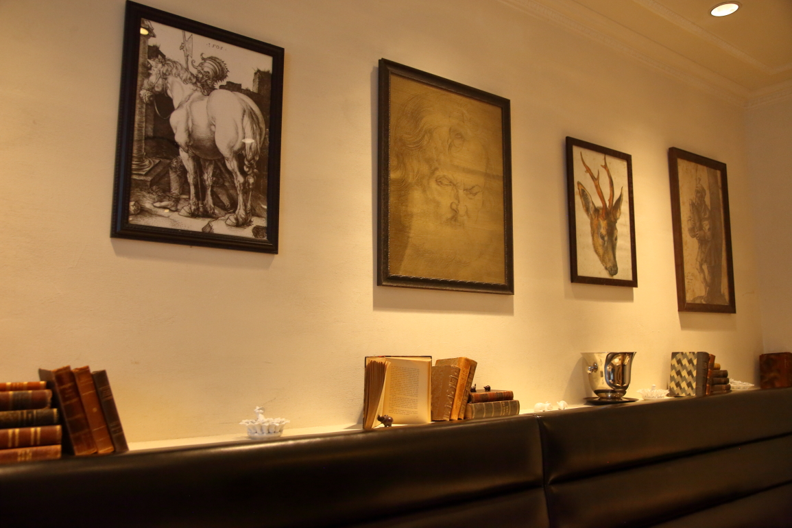 壁には飾られているのは、ドイツ人版画家のアルブレヒト・ビューラーの作品。イタリアワインのラベルにもよく使われているとか。さりげなく置かれた年代物っぽい洋書もステキ!