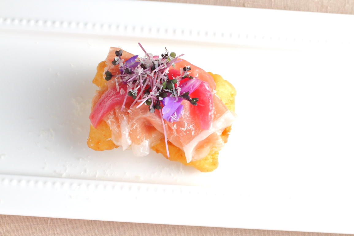 前菜は「穴子のパステッラ ストラッキーノとパルマ産プロシュート」。パステッラとは衣揚げのこと。「リストランテ ヤギ」ではガス入りの水で生地を溶いた衣で穴子を揚げていて、外はカリッと中はふんわりとした仕上がりです。