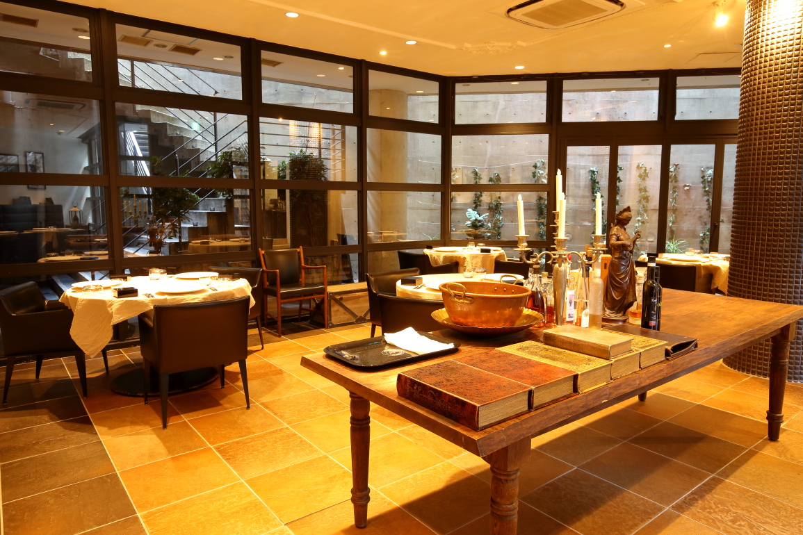 お店は地下にありながら陽光が差し込み、スタイリッシュで落ち着きのある空間。壁やタイル、天井からテーブルの配置まで、すべて八木シェフが考えたそうです。