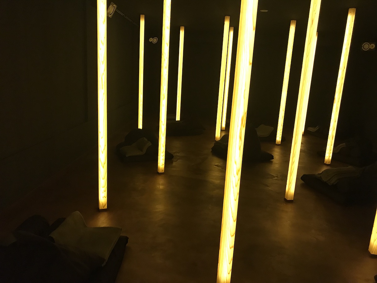 スタジオでまず目に入るのが、暗闇の中にポツポツと浮き上がっている柱。美しい木目がライトで光り、神秘的なムード満載!スタジオ内は少しひんやりと感じる温度に設定されているので、まるでお寺を訪れたときのような凛とした雰囲気も演出されています。