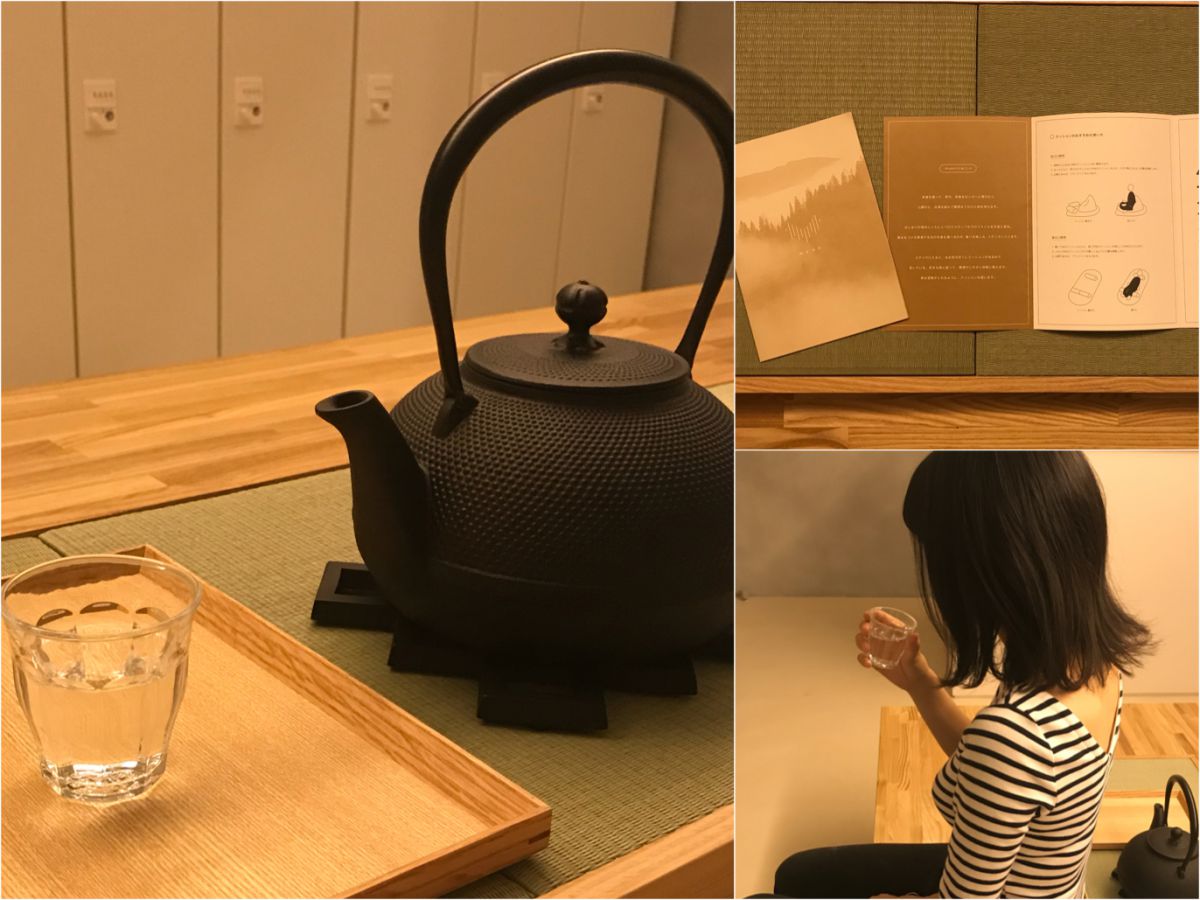 準備が整ったところで、瞑想までの順序や注意事項が書かれた冊子を渡されます。瞑想に向けて集中力を高めてもらいたいことから、言葉で説明するのではなく冊子で対応することになったそう。さらに南部鉄器で沸かした白湯を頂きます。少し鉄っぽい独特な味が味覚も刺激。