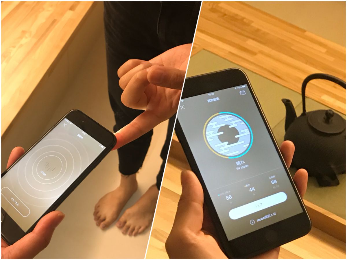 「ムオン」はスタジオだけでなく、心の状態をチェックできるiPhone専用の瞑想アプリもリリースしています。このアプリは、スマホのカメラによる心拍の測定でリラックス度と集中度が測定できるもの。測定結果は「小雨」「曇り」「晴れ」「日本晴れ」などで表現されます。(通常スタジオでアプリのお試しはできません。)