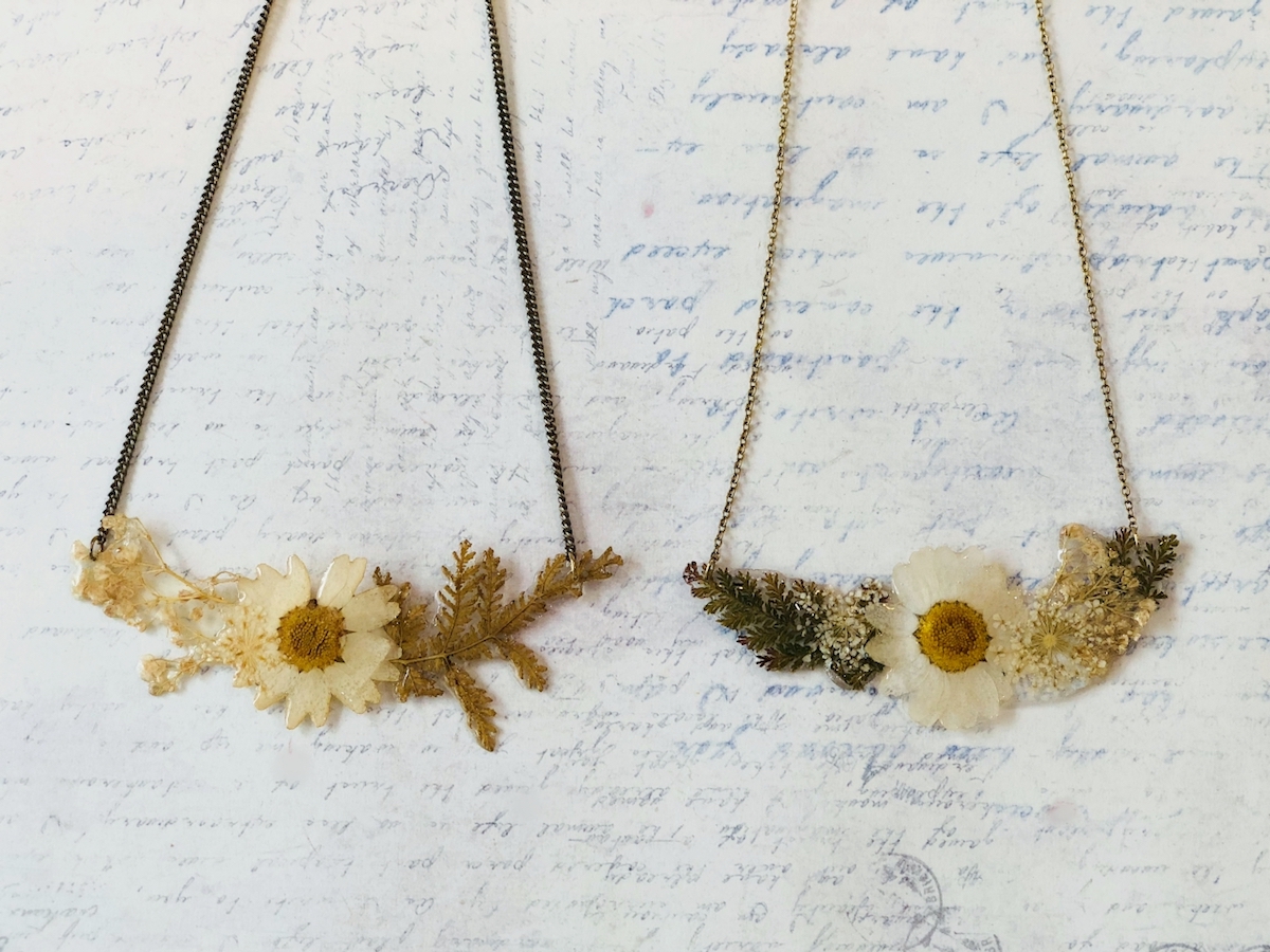 写真のネックレスは、左が8年ほど前、右は最近作られたもの。2つを並べてみると、8年の間で色が変っていくのが分かります。時間とともに自然と退色していく変化の様子も楽しむことができ、よりアンティーク感が増していくのが「ボタニカルレジンアクセサリー」のよさの1つなんです。