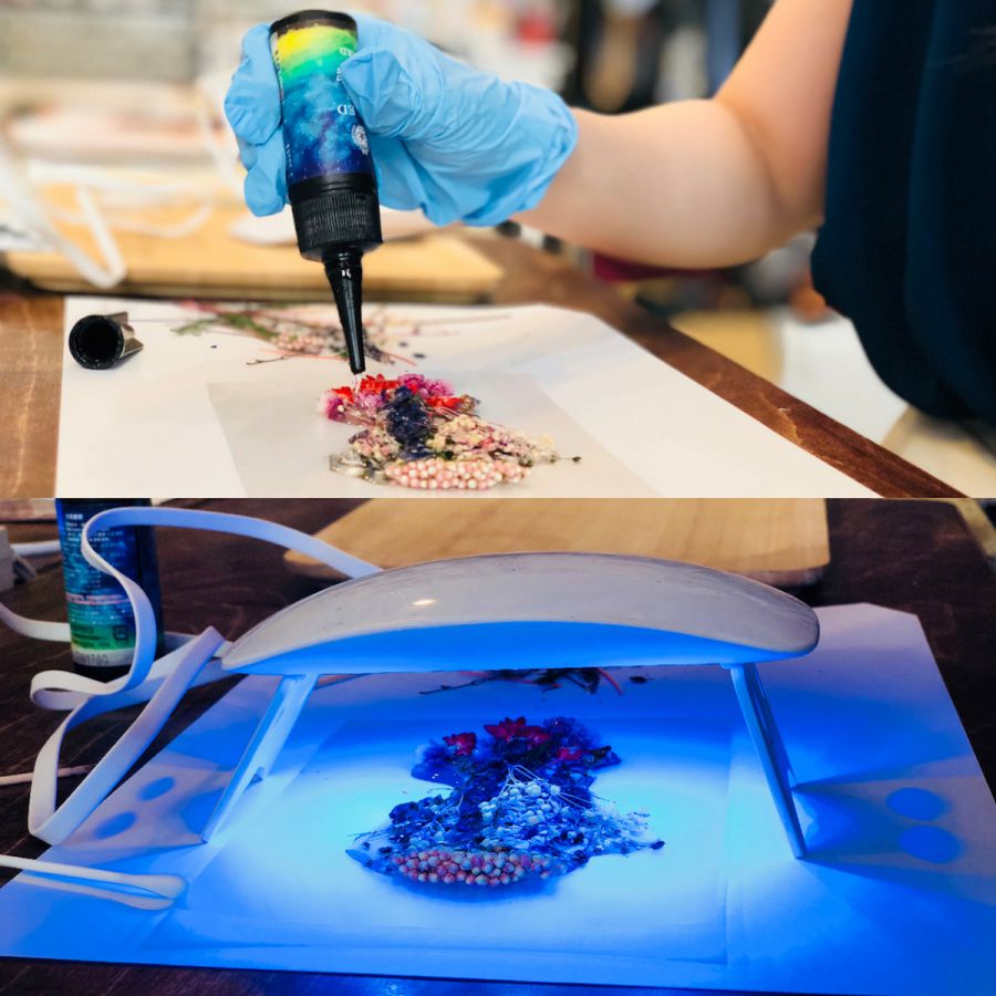 形が決まったら、透明なUVレジンで固めていきます。花の上から周りにはみ出ないようにレジンを流し、気泡をしっかり潰しながら隙間を埋めたら、UVライトで硬化。固まる様子を見ていると、待っている時間でさえわくわくしてしまいます!