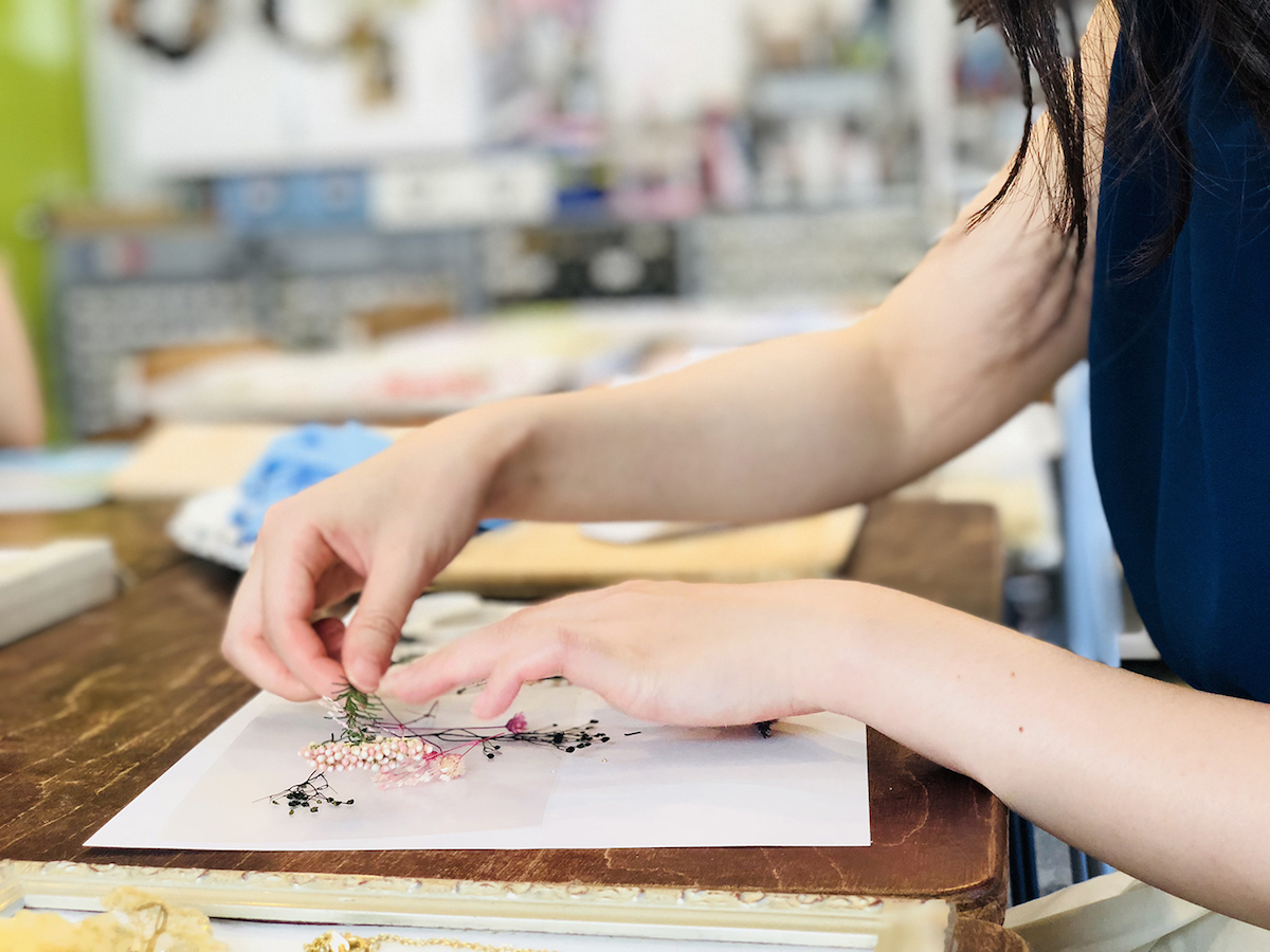 素材選びが終わったら、コラージュするように素材を並べていきます。このデザインの時間が1番悩ましい工程。「並べた形がそのままアクセサリーの形になるので、配置には少しコツがいるんです」と先生。レジンが周りに流れてしまわないように、花同士をくっつけて密度高めに配置するのがポイントだそう。