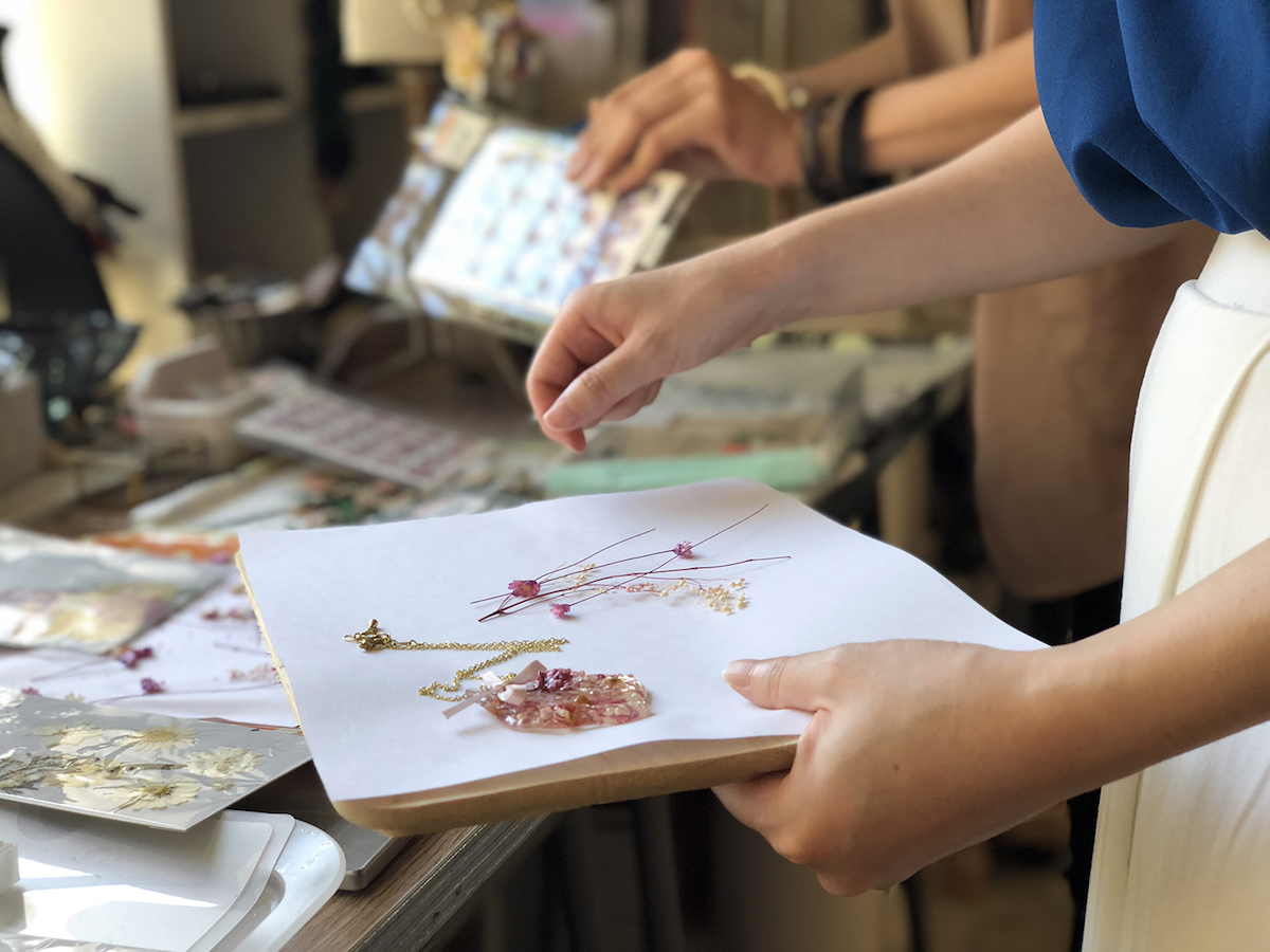 「ボタニカルレジンアクセサリー」のワークショップでは、ブローチやピアス、バレッタなどさまざまなアクセサリーが作れますが、今回は大ぶりのネックレス作りに挑戦!