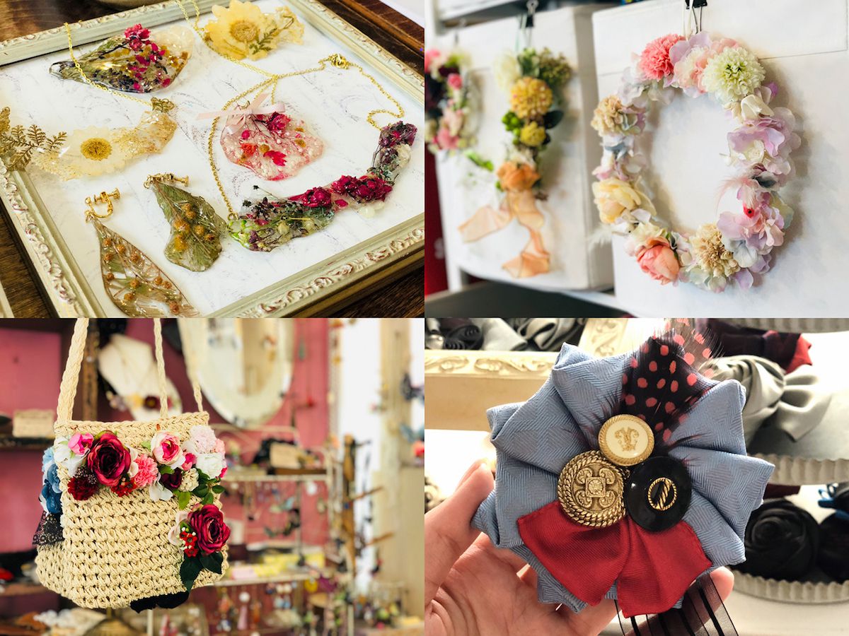 今回挑戦するのは、写真右上の「ボタニカルレジンアクセサリー」のワークショップ(6400円)。ドライフラワーの色や形を生かして、ナチュラルな風合いのアクセサリーが作れると人気のワークショップです。レジンで好きなパーツを閉じ込めて固めたり、パーツ同士を接着したり、アイデア次第でいろんなアクセサリーが作れます。