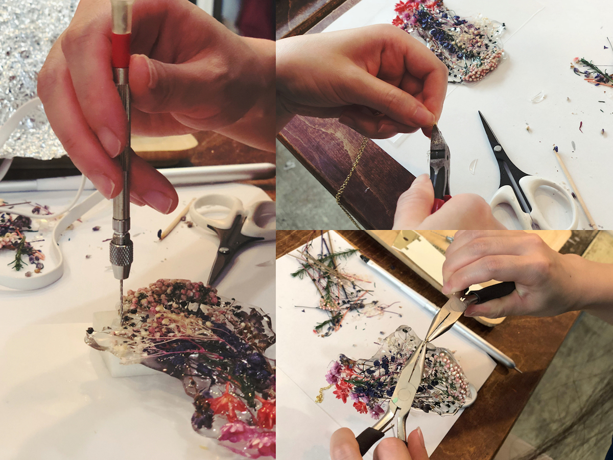 メインのレジンが完成したら、最後の工程へ。工具で穴をあけ、パーツをつなぐ役目をしている丸カンを挟んで開いてチェーンを通し…と、細かい作業に悪戦苦闘!工具を使うなんて中学生の工作の授業以来ですが、最後まで気を抜かずに仕上げていきます。