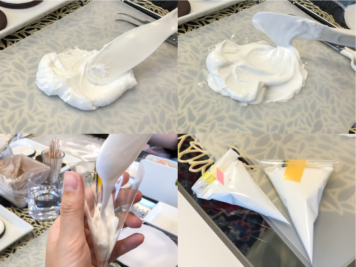 まずはアイシングの準備から。ベースとなるアイシングをそのまま使う固いタイプと、ベースに少量ずつ水を加え、適した柔らかさになるまで練った柔らかいタイプの2種類を準備していきます。固さを調整したらコルネという専用の小さな絞り出し袋に詰め、準備OK!