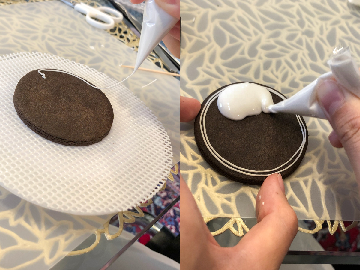 簡単そうに見えますが、この縁取りに1番苦戦…!絞り口をクッキーに直接付けないよう、空中に線を描くように絞り出すのですがなかなかうまくいかず、何度かやり直すことに。