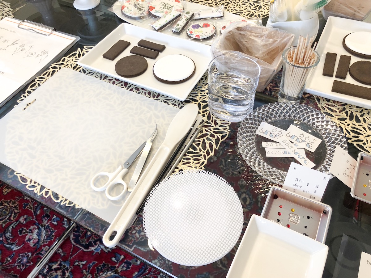 作業するテーブルにところ狭しと並べられた道具の数々にテンションUP!なんと、土台となるブラックココアクッキーも先生の手作り。発酵バターなどこだわりの材料が使われていて、おいしそうな香りが漂ってきます…。つまみ食いしたい気持ちを抑えて、早速スタート!
