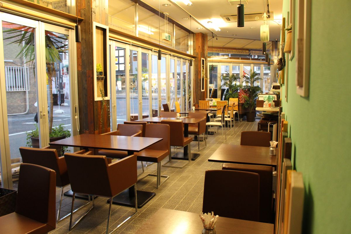 お店は、たくさんの窓が印象的なオープンで明るい空間。茶系の家具や雑貨でまとめられた、ナチュラルな雰囲気。1品1品のボリュームがたっぷりあるので、お友だち同士で別々のオーダーをしてシェアするのも楽しそう。