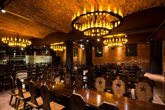 ツアーのラスト、お待ちかねの試飲会場は1階のスターホールへ!海外のビアホールのような素敵な雰囲気で、気持ちよく飲めそう。