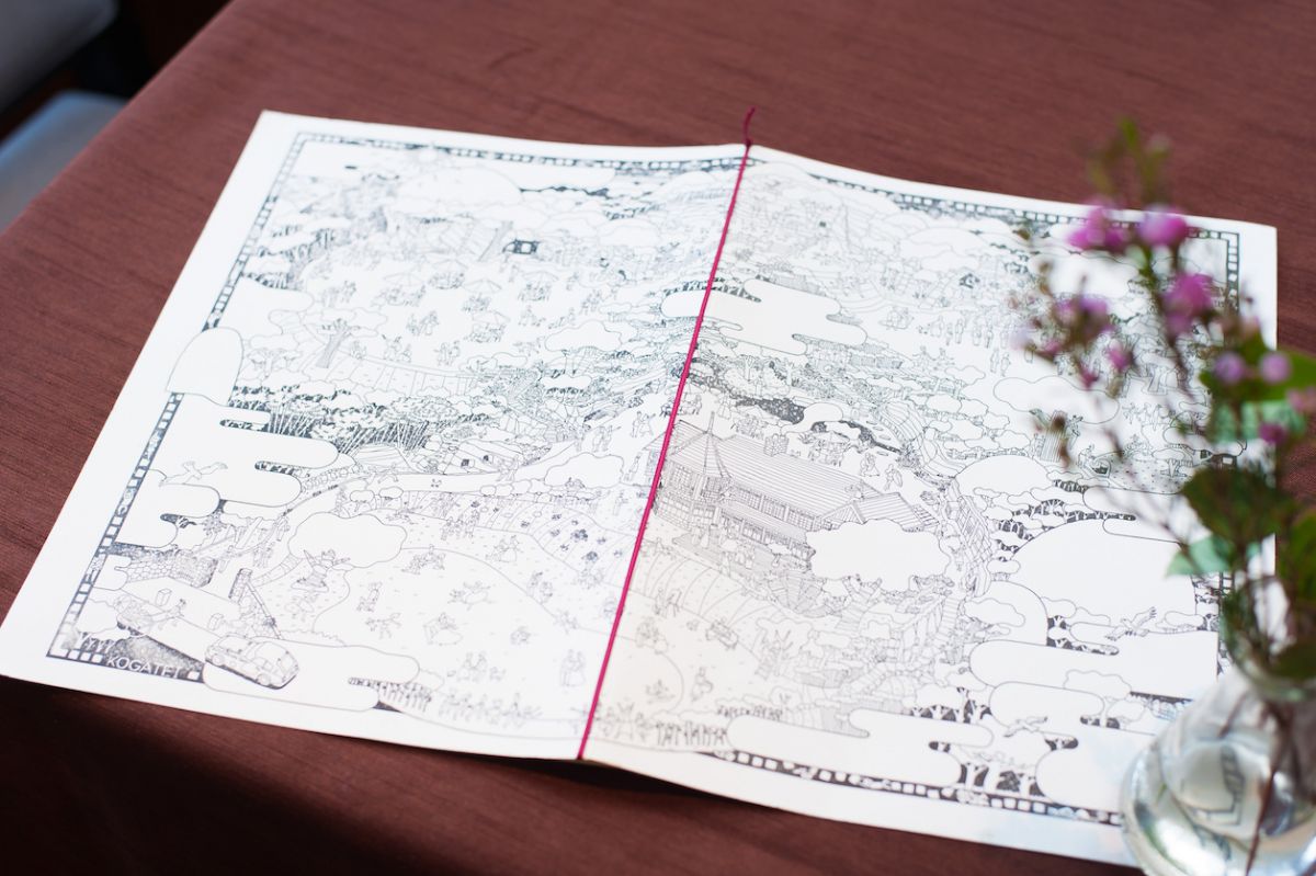 メニューの裏側を見ると、独創的なイラストが。武井さんいわく、こちらは「古我邸」の“未来予想図”なのだそう。なんと、「古我邸」の敷地や設備を整え、さらに多くの人が集まれる場所にするという計画があるのだとか。