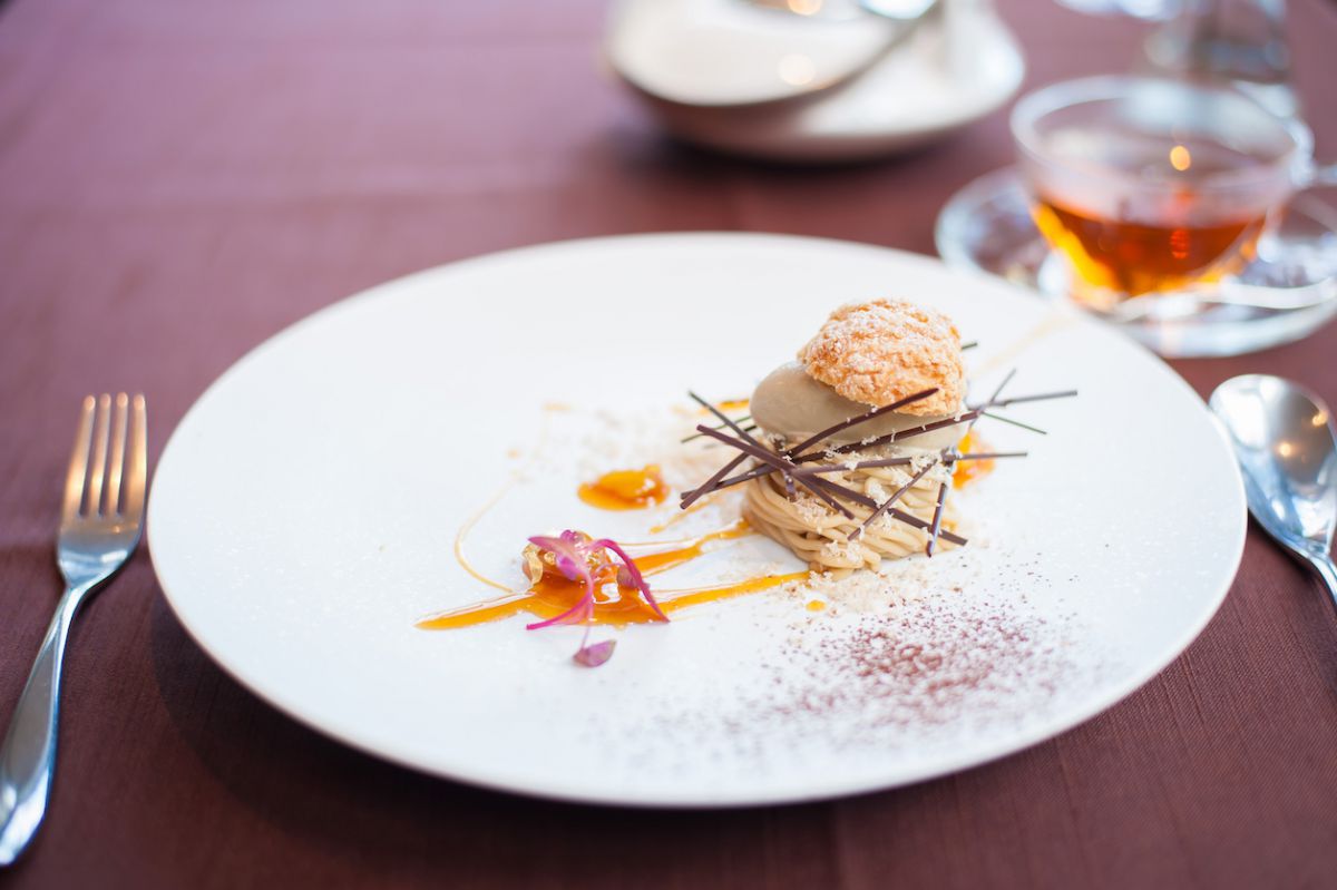 デザートの「和栗 焙じ茶 チョコレート」。洋菓子に和のテイストを巧みに盛り込んだ一品です。