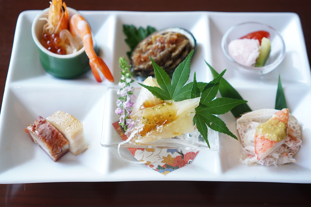 まずは、「前菜の盛り合わせ」から。中央には、フカヒレの冷製。その脇にアワビ、ズワイガニ&毛ガニ、やまと豚のチャーシューなどが並びます。