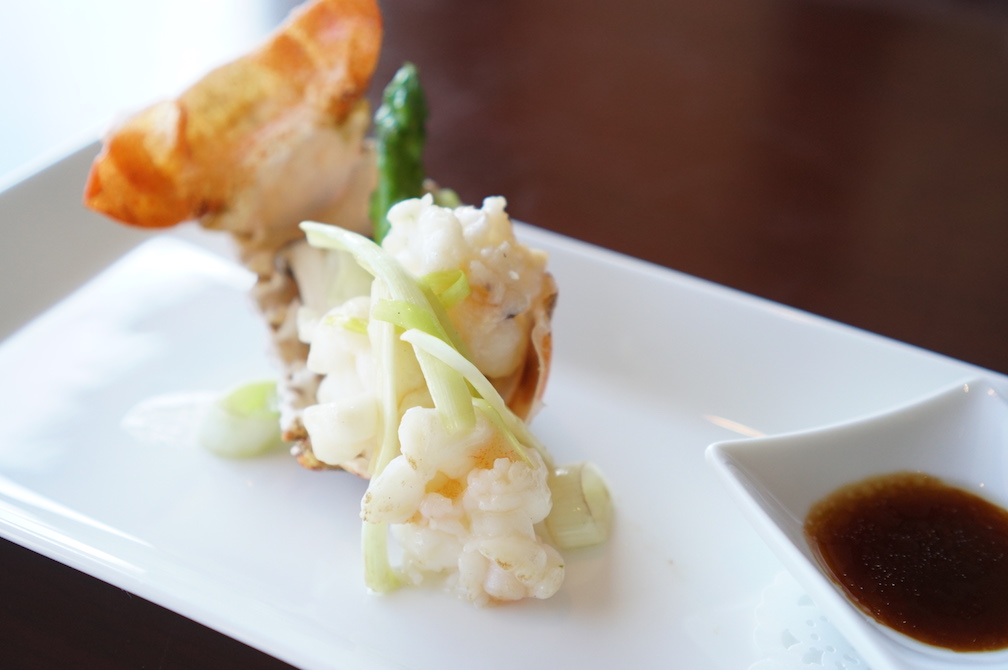 スープと小鉢のあとは、メインの1品目「セミ海老の野菜炒め2種ソース添え」が。セミ海老は、「伊勢海老よりおいしい」ともいわれる高級食材。