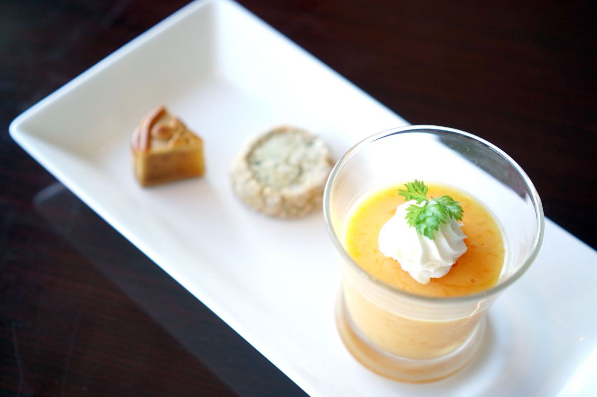 続いて、「ズワイ蟹爪の海老すり身カダイフ捲き揚げ トマトチリソース」。カダイフは、フレンチなどで用いられるトウモロコシ粉を糸状にした食材。カリッとした食感が、フレッシュなトマトが香るチリソースと相まって、ズワイ蟹の風味を引き立てます。
