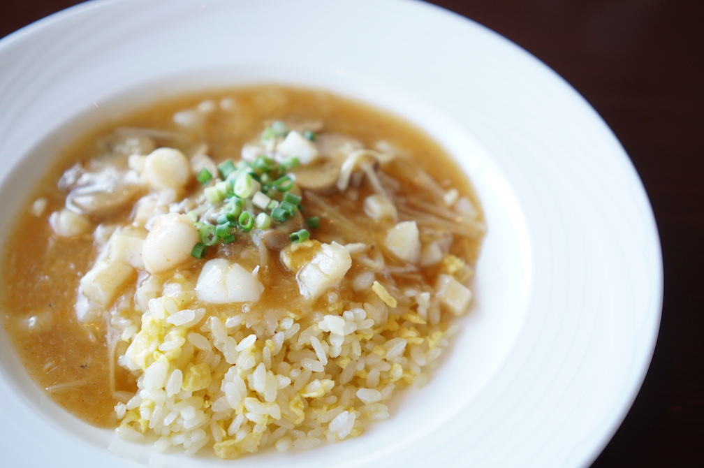 〆は「海鮮と野菜の上海蟹味噌あんかけチャーハン」。こちらも蟹味噌のコクが口いっぱいに広がるリッチなひと皿。メインの後でもペロリと食べられます!
