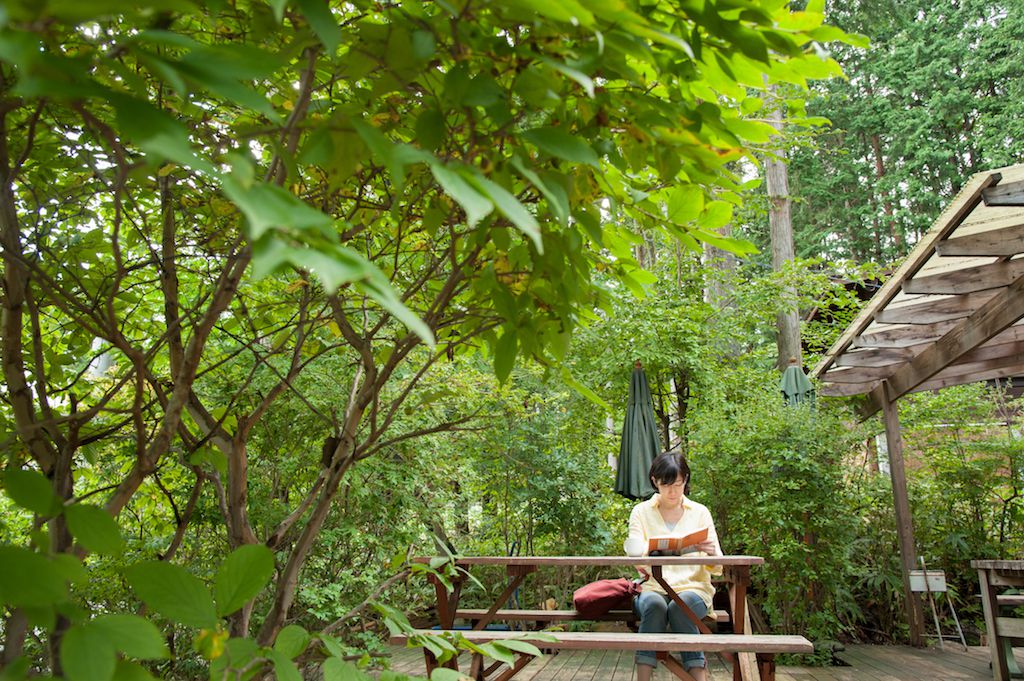 読みたい本をみつけたらウッドデッキのテラスへ。時間の許す限り、のんびりと読書を楽しみましょ。