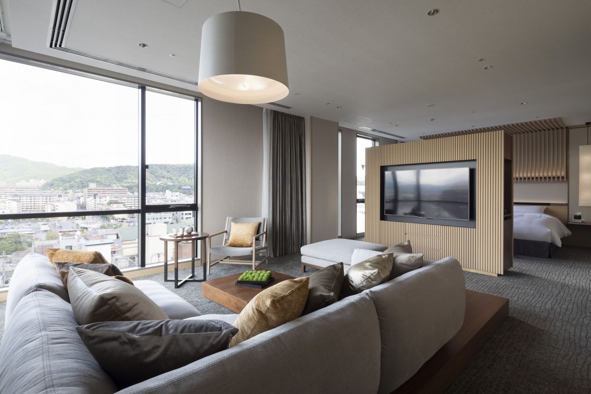 京都でのステイをリッチに過ごしたい方は、最上階の角部屋に位置するプレミアムスイート(76㎡)は、いかがでしょうか?L字型のゆったりしたソファからは東山三十六峰のゆったりした景色が望め、また、お盆には五山の送り火を静かに鑑賞できます。