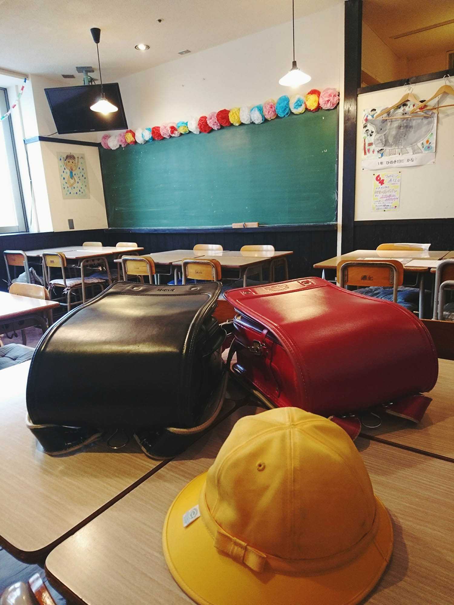 最後にご紹介するのは、入口に置いてあるランドセル&帽子。もちろん、着用しての写真撮影もOKです。先生にお願いして、全員小学生モードになって記念撮影を楽しんじゃいましょう!