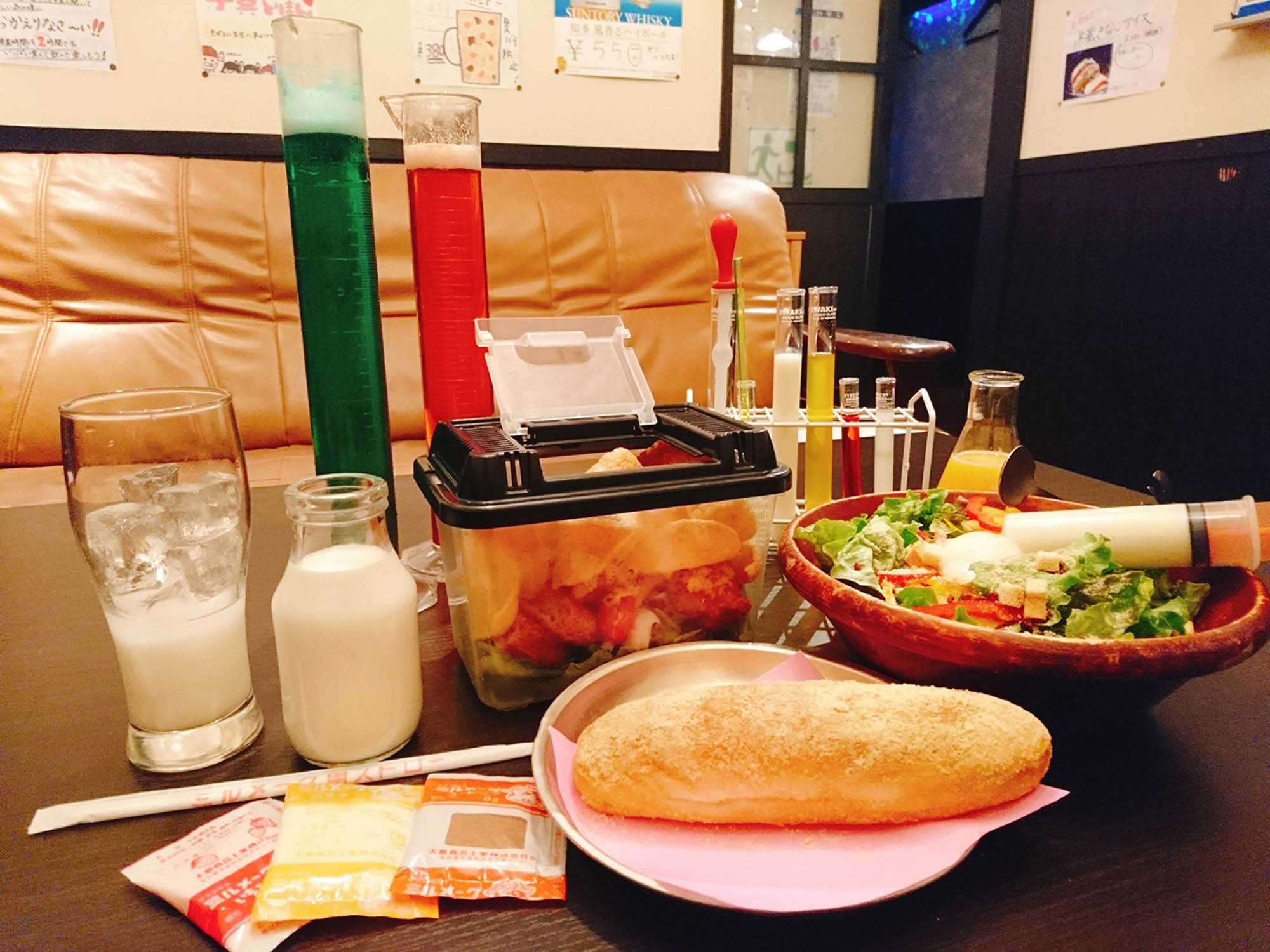 今回は人気のメニューをアラカルトで注文。牛乳に溶かして飲む粉末の調味料ミルメークにリキュールを混ぜた「大人のミルメーク」や、ドレッシングが注射器に入った「シーザーサラダ」、メスシリンダーにカラフルなビールを入れた「メスシリンダービアカクテル」など、見た目はもちろん、楽しい仕掛けのメニューばかりだから盛り上がること間違いなし!