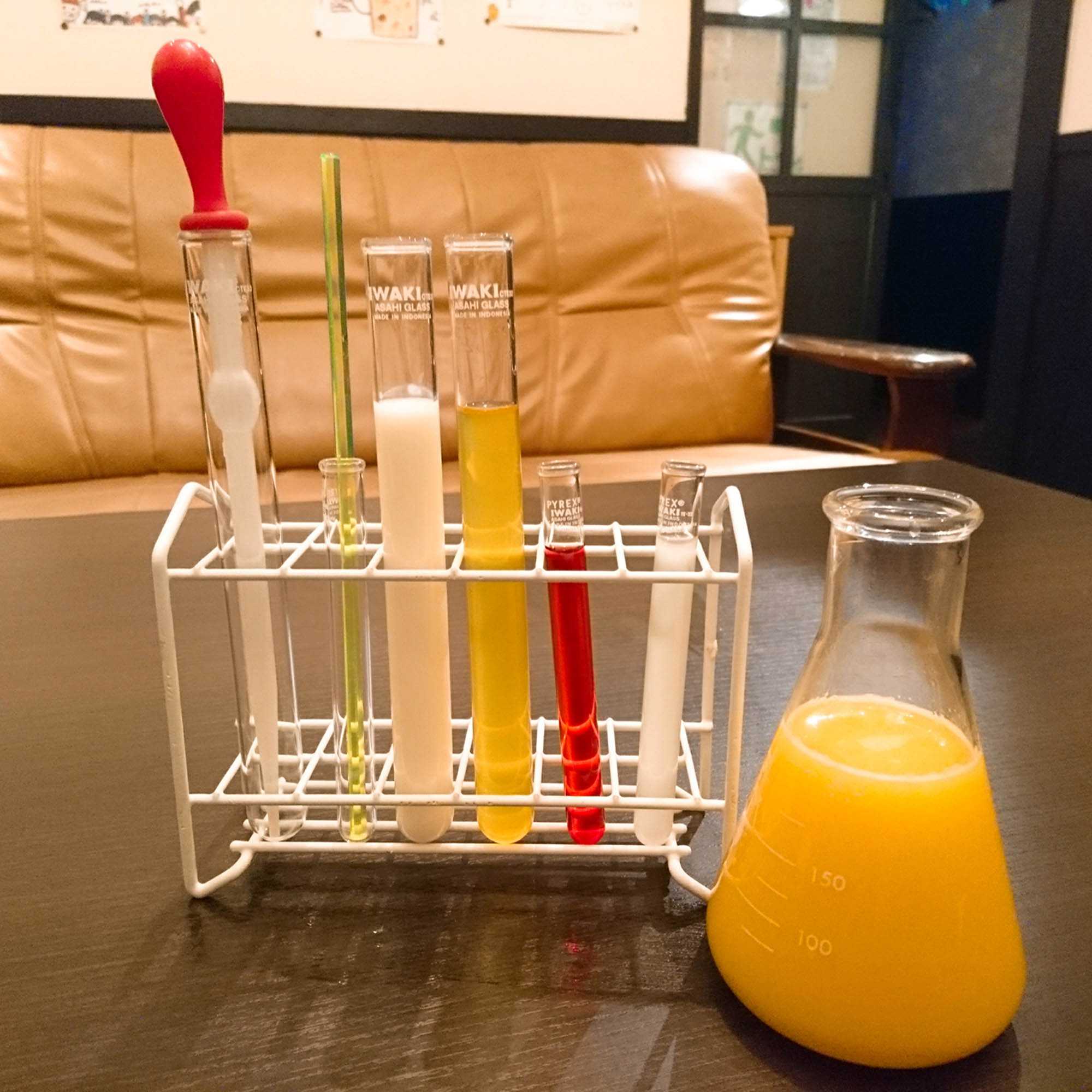 スポイトを使って、試験管のリキュールをフラスコに入れれば、まるで理科の実験をしているかのよう。いろいろ試して好きなカクテルの調合を見つけてみてはいかが?
