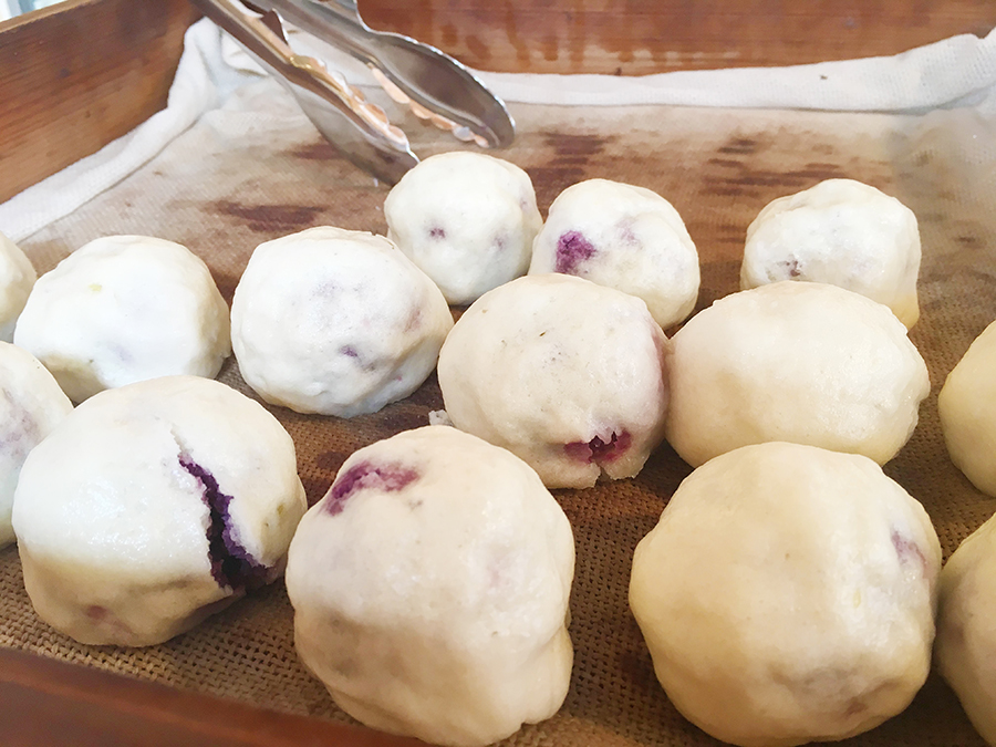 同じく"菓子屋横丁"にある人気店「稲葉屋本舗」。ここでは、ふかふかの蒸したての「紫芋まんじゅう」(1個110円)が食べられます。中には真紫の餡がびっしり!ドーナツ、ようかん、まんじゅうなど約10種類の自家製商品が並びます。
