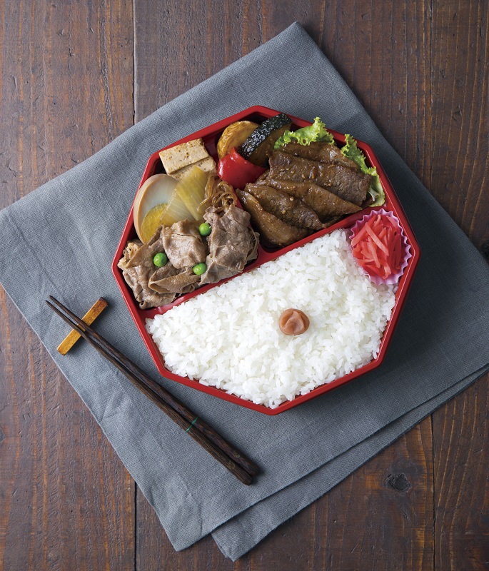 国産黒毛和牛のすき焼と焼肉を両方楽しめる「黒毛和牛 味くらべ弁当」1折2650円。八角形の入れ物もかわいい!【浅草今半 シナガワビーフスタンド (エキュート品川)】※エキュート品川限定