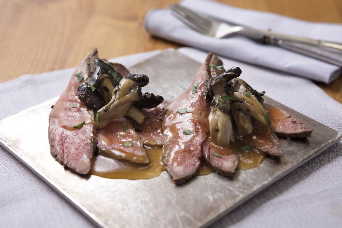 ローストしたひらたけと牛肉の組み合わせが絶妙な「牛肉のグリル 霜降りひらたけのロースト添え」798円/100g。パーティーなどでも喜ばれそう!【アール・エフ・ワン(エキュート品川 サウス)】※量り売り