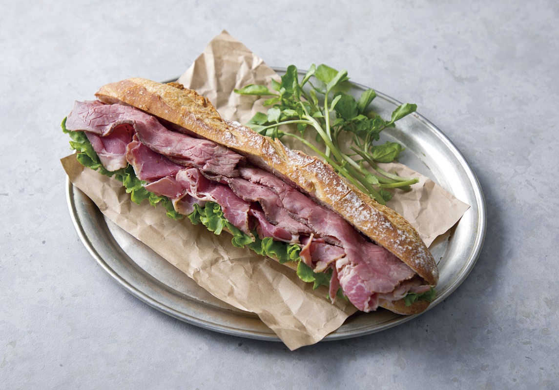 「アンシェン・ブッフ(ロティ&パストラミ)」1本 1188円、1/2本 594円。PAUL自慢のフランスパンに、ローストビーフやパストラミビーフがたっぷり。【PAUL(エキュート品川)】※エキュート品川限定