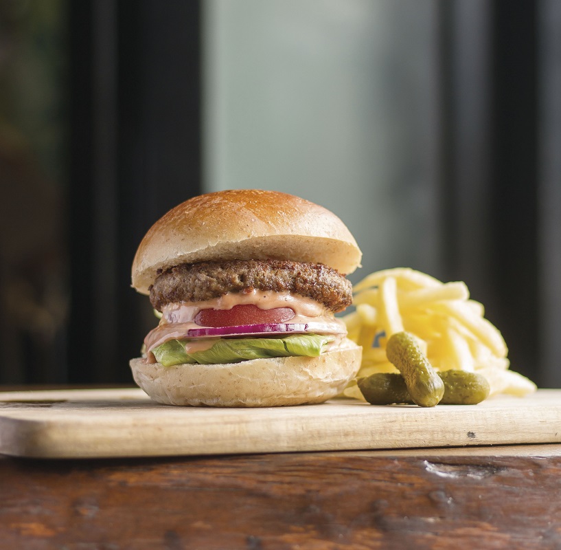 「TAMEALSクラシックバーガー(フライドポテト付)」900円(1食)は、全粒粉を使ったオリジナルバンズに食べごたえのあるパテを挟んだ王道バーガー!【タミルズ(エキュート品川 サウス)】