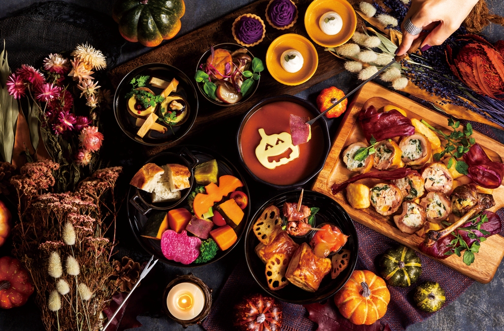 プランで提供されるのは、秋の味覚を楽しむ旬の素材のオードブルをはじめ、フォアグラとホロホロ鶏を組み合わせたワンランク上のメニューなど、洗練されたメニューの数々。なかにはインスタ映えしそうなパンプキンフォンデュなど、ハロウィン仕様のかわいいメニューも。“大人ハロウィン”を演出したメニューが並びます。