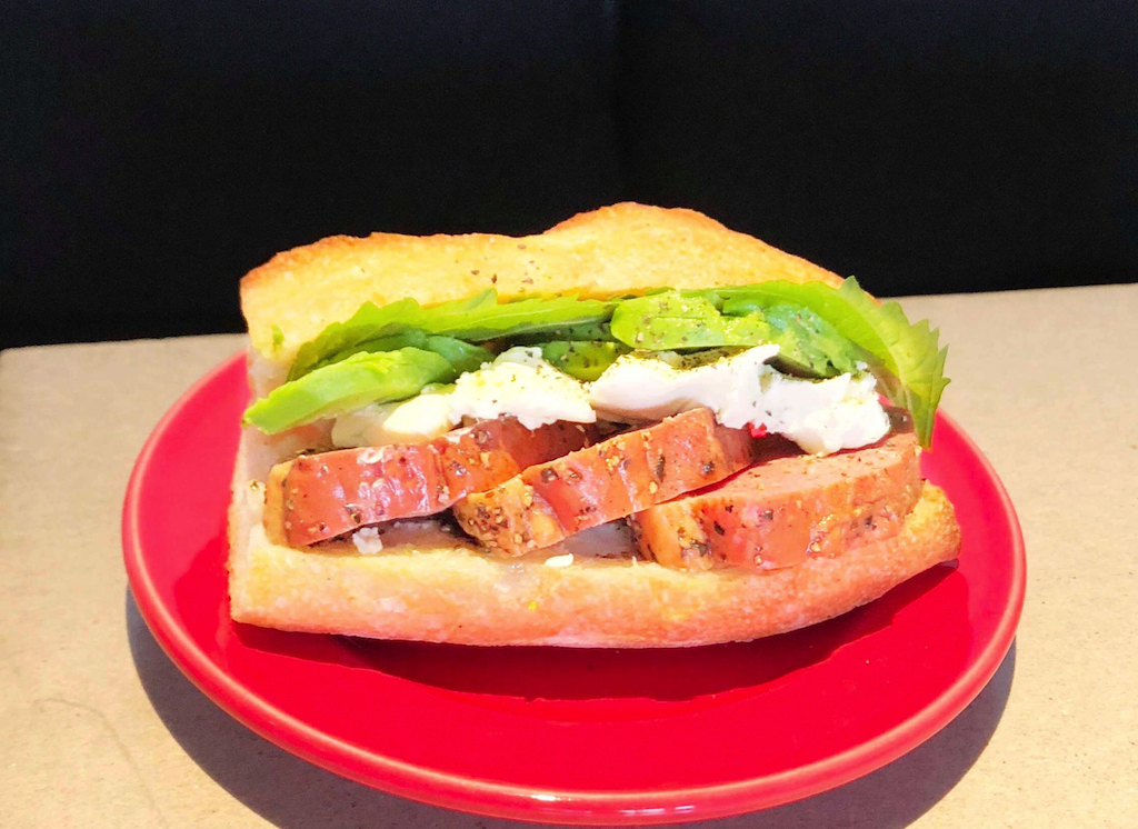 今回オーダーしたのは1番人気の「サンドイッチ(紅茶鴨×柚胡椒×大葉×アボカド)(ハーフ480円)。厚さ1.5cmほどのボリューミーな紅茶鴨は柔らかく、さっぱりしながらもジューシー!アボカドとクリームチーズのクリーミーさに加え、大葉でさっぱり、柚胡椒でぴりりと締まった絶妙なバランスが絶品です!