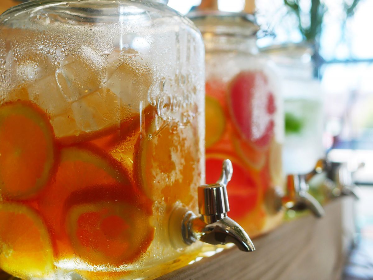 店内に設置されている「フレッシュフルーツウォーター」各種はどれだけ飲んでも無料!ほんのりトロピカルな南国風空間にマッチする嬉しいサービスです。