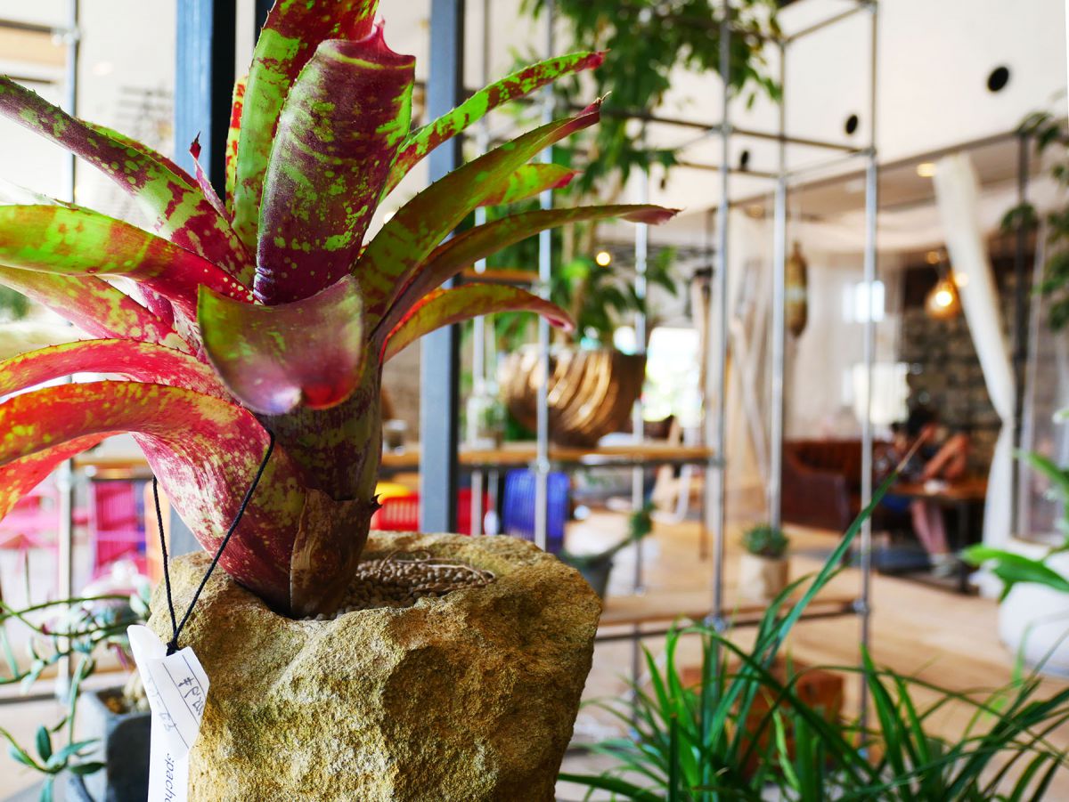 ガラス張りの広々とした店内には世界各国の珍しい植物が並んでいて、フローリングや石の壁、個性的なオブジェにもナチュラルに溶け込みます。中庭に青々と茂るオリーブの木は、なんと樹齢500年!