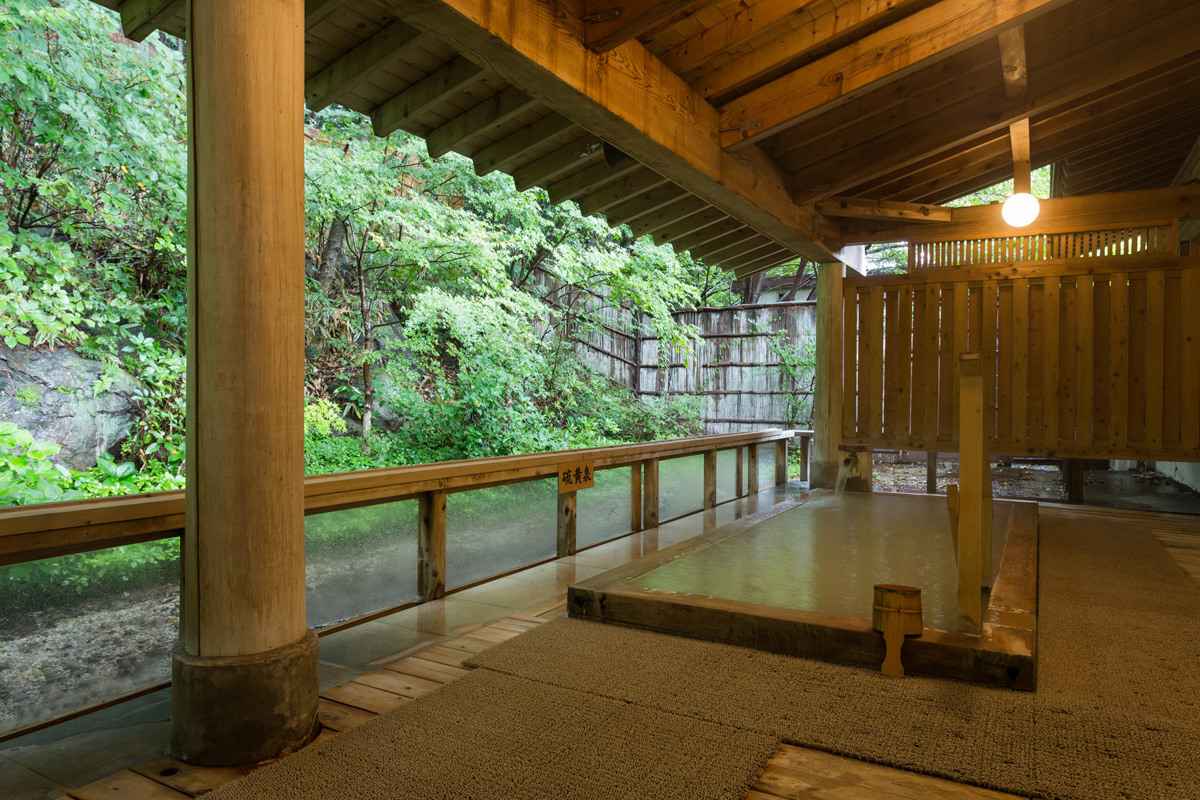 建物全体が檜で造られており、一歩中に入れば檜のいい香りに包まれます。泉質は、カラダを芯から温めてくれる硫黄泉。露天風呂には、ぬるめとあつめの湯船が備わり、自分の好みで湯加減を選べます。