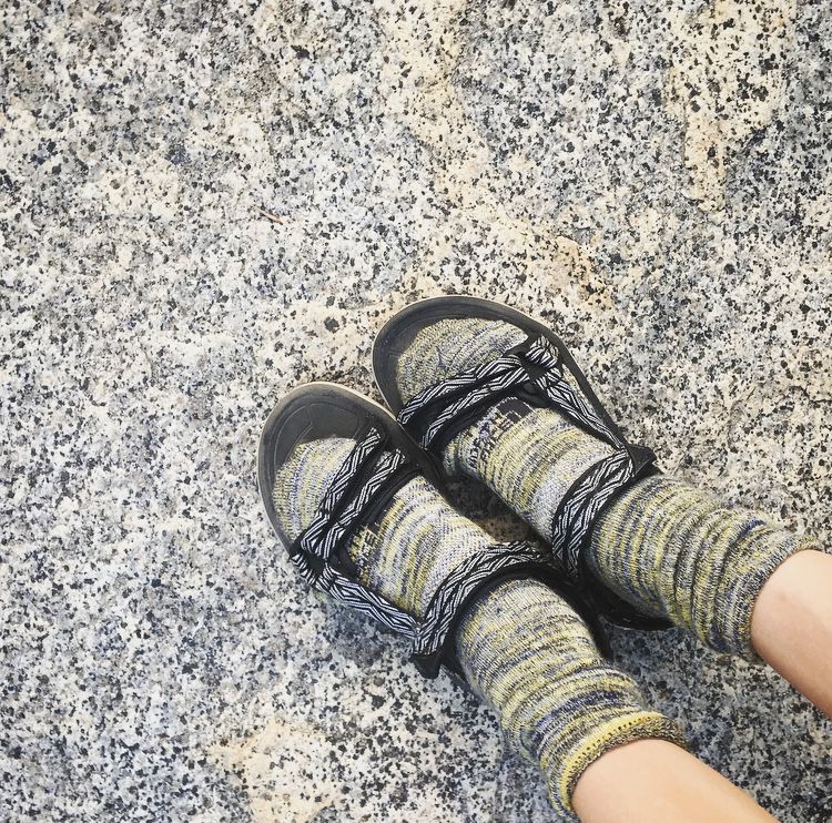アウトドアで絶対手を抜かないのが、靴選びです。ケガや靴ズレなどを防いで楽しく快適に過ごすために、スポーツサンダルやトレッキングシューズなど、足をしっかりホールドして、岩場も楽に歩ける本格仕様のものが不可欠。この時期は、脱ぎ履きしやすいtevaのサンダルに、厚手のトレッキングソックスをコーディネート。カラフルでもこもこした風合いが、足元に可愛げをプラスしてくれます。