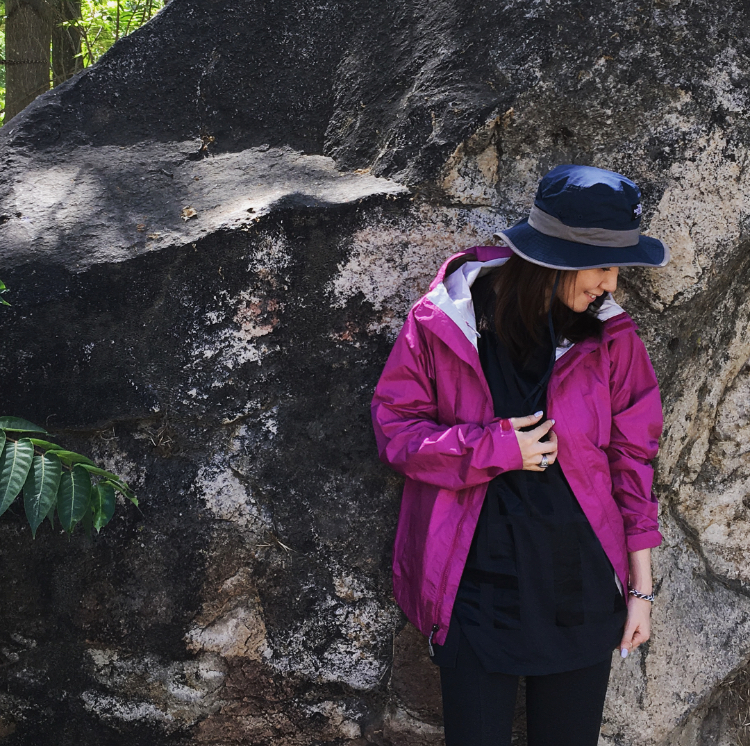 今季はスポーツMIXがトレンドなので、選ぶなら普段着の延長のカジュアル服よりも、本気のアウトドアアイテムを取り入れるのが気分です。今回は、パタゴニアのマウンテンパーカ。突然雨が降ったり、朝晩は冷え込んだり、変わりやすい気候にもストレスなく対応できるし、キレのいいビビッドなピンクが風景の中でフェミニンに映えますよね。何年も前に買ったものですが、トレンドに左右されずずっと着られて、普段もときどきレインコート代わりにワンピースに羽織ったりして活躍していまます。