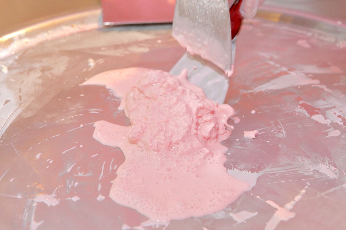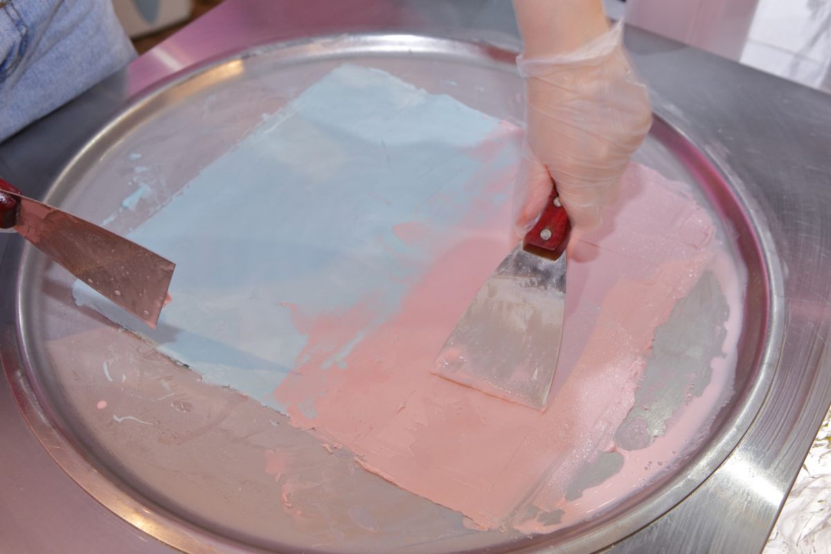 液状のアイスをヘラでまんべんなく冷やしていくうちに、あら不思議!液体から少しずつシャーベット状になっていくではありませんか。完全に固まってしまう前に、均一の厚さに伸ばして3分ほど待ちます。