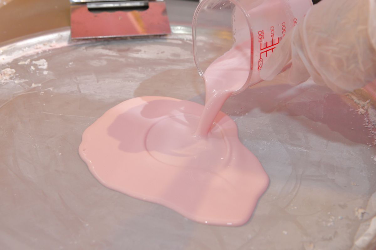まずは、マイナス13~14℃に冷やしたコールドプレートに、牛乳や生クリーム混ぜ合わせた液状のアイスを流します。