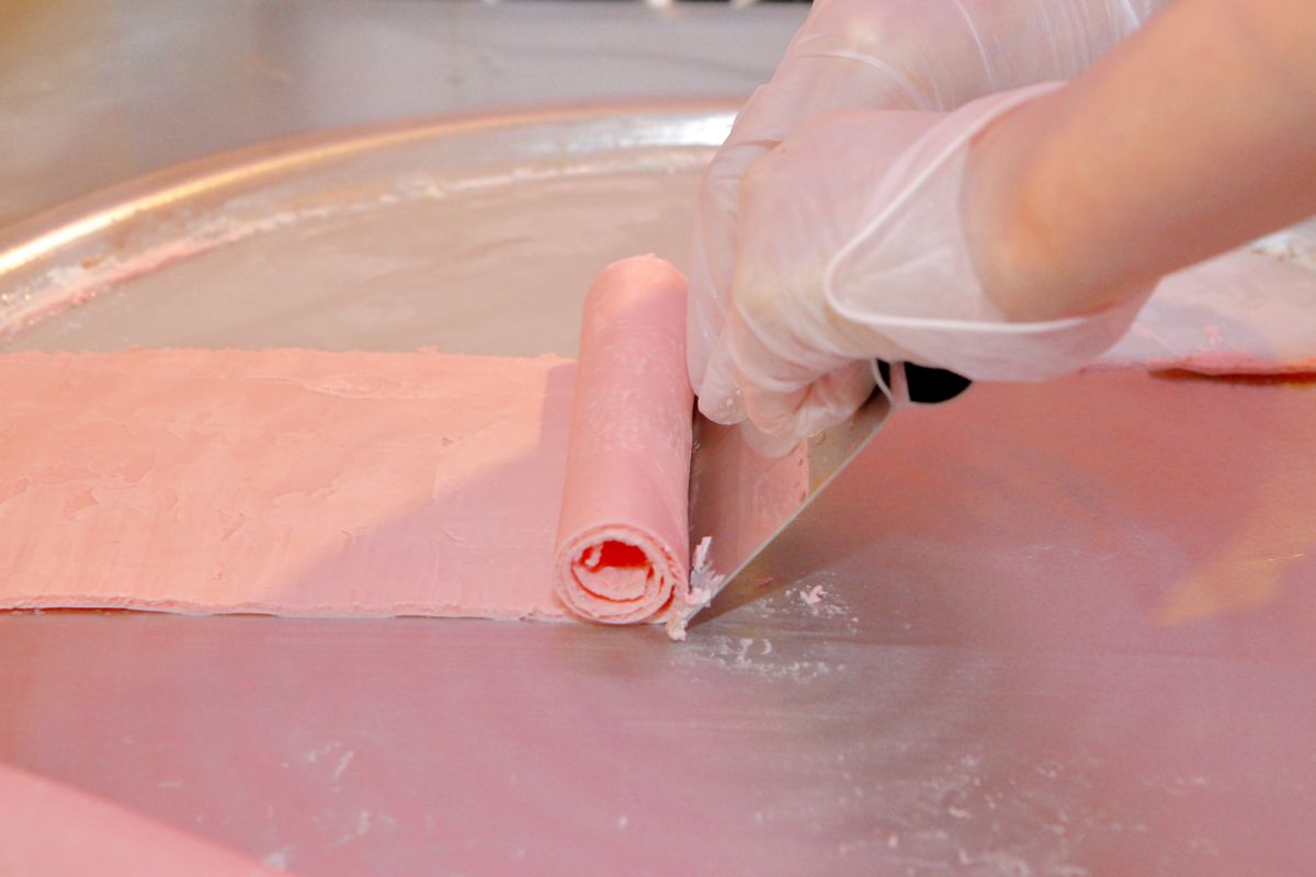 アイスが固まったら、いよいよ製造工程のハイライト、クルクルタイム♪ プレートからアイスクリームをはがすようにクルクルと巻き取っていくと、あっという間にロールアイスができあがりました。意外と簡単そうに見えますが、ヘラに力を入れすぎるとアイスが切れてしまうので、上手にロールさせることが一番難しいそう。