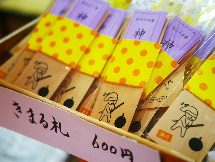 本のしおりにできる「きまる札」(600円)も人気で、夏バージョンはスイカ割り・・・。材料に「能登ヒバ」を使うなど品質にもこだわりが。「きまちゃん」の公式グッズショップと言えるほどのラインナップです。