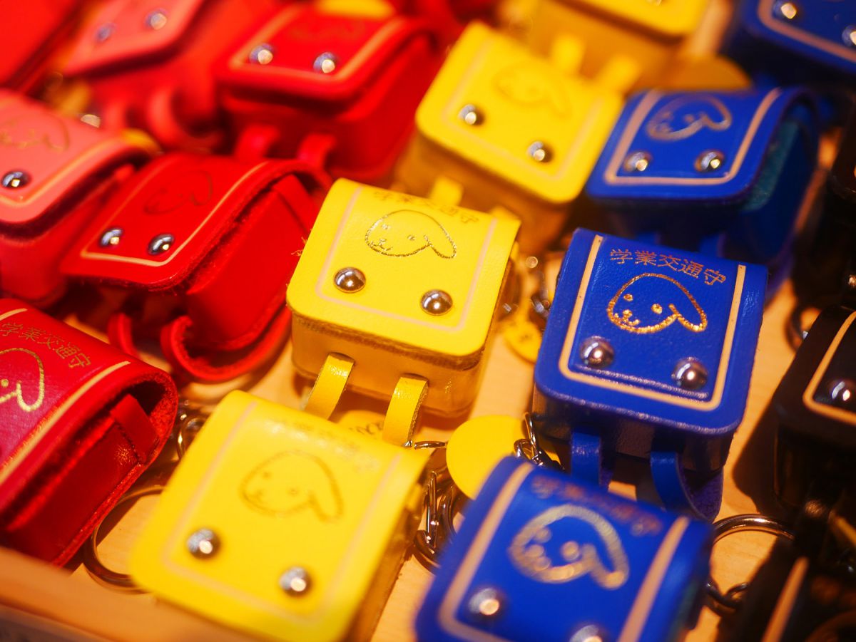 ミニチュアランドセルタイプの「学業交通守」(800円)もカラフル!ここにはさりげなく「きまちゃん」フェイスもあしらっており、実物大も欲しがられるほどお子様に人気(※実物大はありません)。