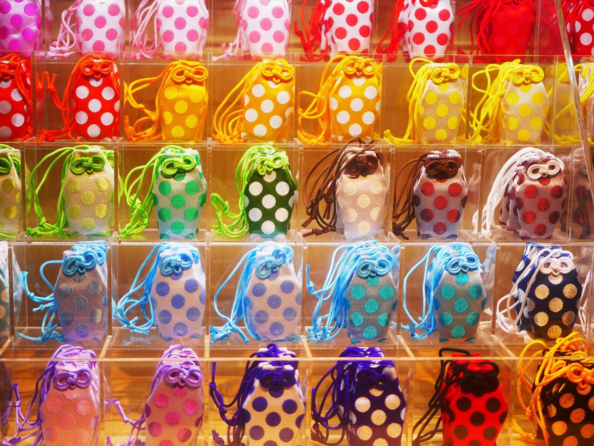 「きまちゃん」だけでなく、カラフルなデザインの「御守」(800円)も豊富なんです!水玉模様だけで41種類もあり、巫女さんに聞いたところ、選びきれずに10分以上迷っているお客さんも多いのだそう。