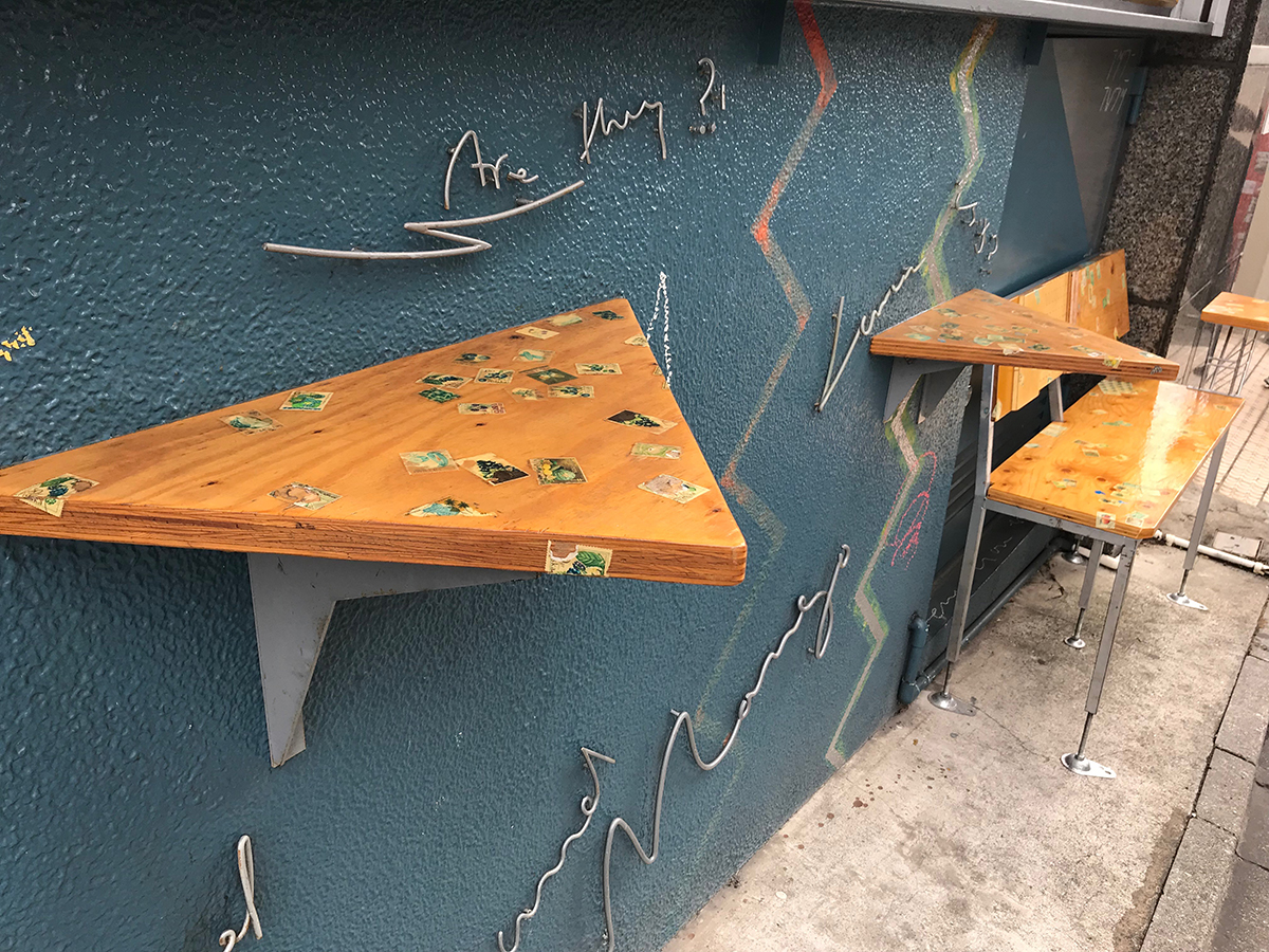 お店の外壁にはフルーツ柄の切手があちこちに貼られた三角のテーブルがちょこっと2つ。どこかレトロでかわいいと、撮影スポットにもなっています。テイクアウト専門店ですが、できたてをここで食べてもOK!