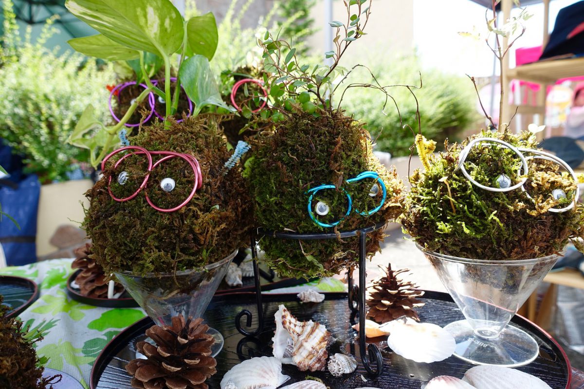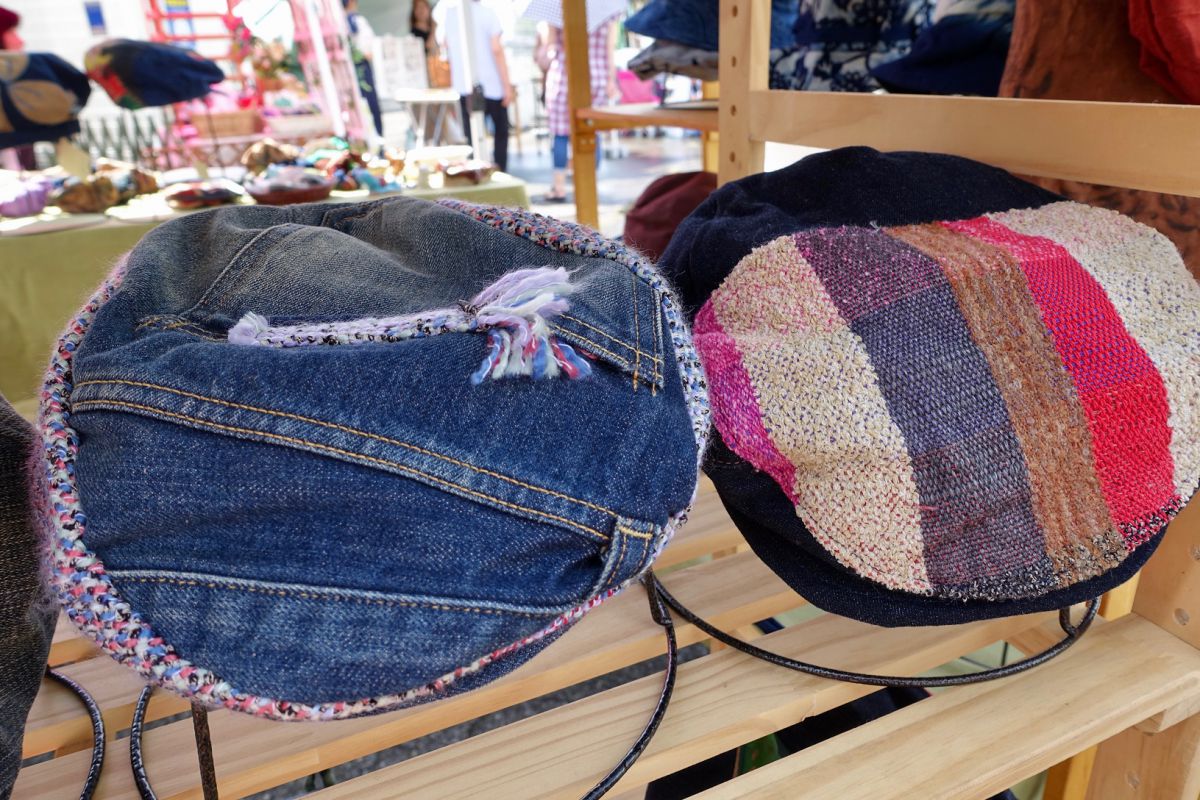 「工房空〜coo〜」のおしゃれなハンチングは裂き織り。障害を持った子たちが1つずつ手作りしているとのことで、この絶妙なカラーリングは感性の豊かさゆえのものだそうです。地元の石屋「よしかわ工房部」では、苔玉やギレでつくったアクセサリーを販売。捨てられてしまうものをもう一度利用しようと始めたといいます。