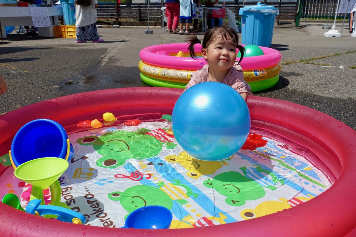 広大な敷地ならでは!飲食スペースのわきにはプールが登場。子どもたちも楽しそうに遊び、まるで近所の公園のようなアットホームなマルシェです。